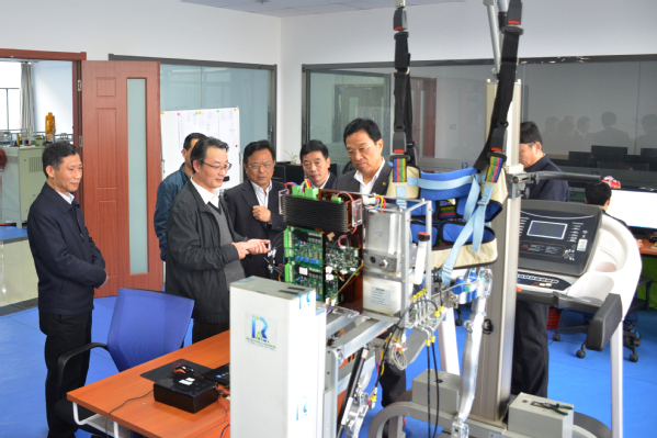 在座谈会之前,调研组实地考察了机器人产业技术研究院、艺术学院。在机器人产业技术研究院,相关负责人向童怀伟一行介绍了研究院的发展历程、运作模式、主营业务及发展情况,童怀伟在参观研究院的工业机器人调试区、可穿戴型下肢外骨骼机器人实验室之后,充分肯定了研究院成立以来的成绩,并就研究院未来发展方向及运营模式与刘宁进行了深入交谈。