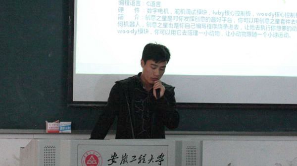 谈玉胜同学重点为大家介绍了机器人分会参与多次机器人比赛的经历,与同学们共享了他由一名新生逐步进入到极客角色的成长过程,他说:“参加机器人比赛,既要有扎实的基础,更重要的是要有浓厚的兴趣和积极探索求新的极客精神”。机器人分会的阜稳稳和郭宇同学也分别介绍了机器人实验室的学习方向和学习方法,建议同学们培养兴趣,多编写代码,多找一些好的代码去阅读,多和身边技术好创新能力强的同学交流。