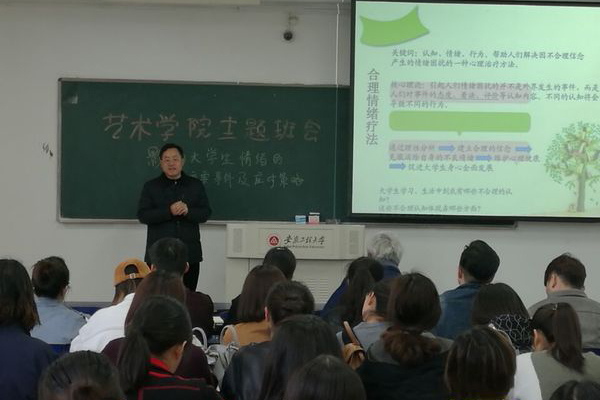 “你的情绪在哪里?”,在正反两种情绪背景下,两组同学分别分享了在校学习或生活中的一件高兴事和一件难过事,让同学们看到了情绪是如何通过表情和肢体动作体现的,并以多样化的方式渗透在生活中。面对老师在会前的调研问卷结果图表,同学们清楚地认识到影响大学生情绪的主要校园生活事件。滕老师呼吁大家要培育积极的情绪体验、消除和正确对待不良的情绪体验,并引入合理情绪疗法,帮助大学生树立合理的认知观。引导大家遇到负面事件时,通过倾诉、运动、转移等方法积极应对,尽快走出阴霾。