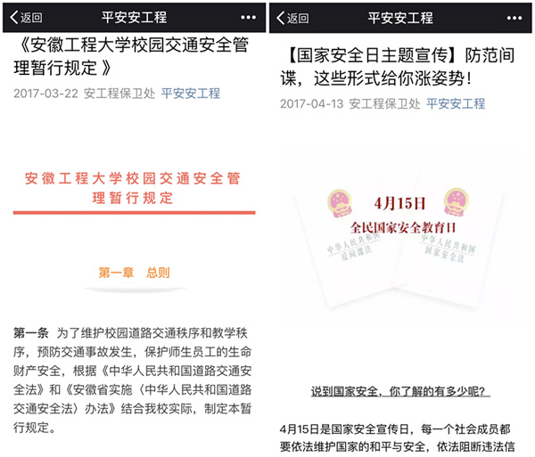 学校充分利用校园网、图书馆电子屏幕、QQ群、公众号、横幅等多种平台和新媒体、新技术,集中开展国家安全日的专题宣传,积极营造浓厚的活动氛围。保卫处微信公众号“平安安工程”专题推送了“防范间谍,这些形式给你涨姿势!”国家安全主题宣传文章,学工部等校内新媒体进行了转载。