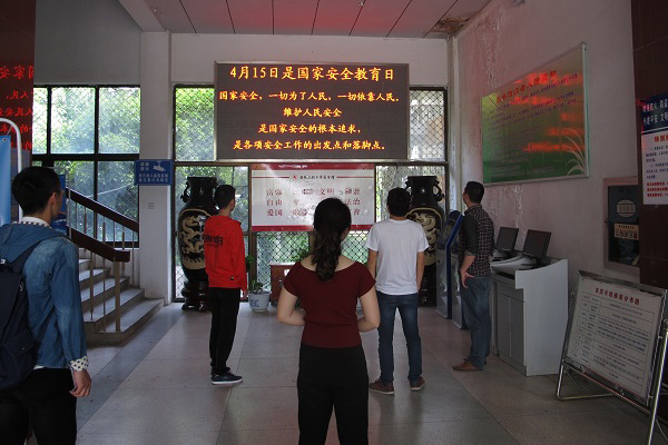 学校食堂电视大屏幕播放了“船厂谍影”、“大山里的‘听风者’”、“营区里的‘伪装者’”和“无声较量”等国家安全宣传教育视频。保卫处把相关教育视频上传到了QQ群,师生自行下载进行了学习。广大师生自发收看了中央电视台《新闻联播》、《焦点访谈》关于国家安全的专题节目。