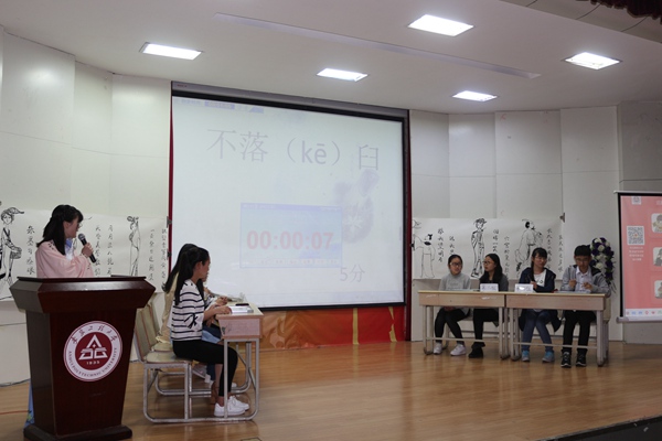 本次汉字听写大赛,初赛以闭卷考试的形式进行。初赛中19个班级的32位优胜者参加今天的决赛。决赛共分成8组,每组4名选手随机抽签产生。决赛由 “汉字听写”、“为成语狂”、“由图猜词”、“根据典故猜成语”、“补全诗句”等内容组成,被分为五轮比赛,每轮比赛采用淘汰制,“复活赛”中前几轮淘汰的小组争夺三等奖。比赛中,“巉岩”、“舆论”、“莽撞”一个个看似熟悉的“生词”让参赛选手绞尽脑汁;“犄角旮旯”、“不落窠臼”、“歃血为盟”平日里耳熟能详的成语让现场观众愁眉紧锁;屈原那一句“长太息以掩涕兮 哀民生之多艰”所体现的心怀天下的气概、杜甫“一去紫台连朔漠 独留青冢向黄昏”所展现的悲凉、三国故事里总结出的四字成语、《诗经》名篇里提炼出的名言警句无不让所有同学产生了深深的共鸣。在限时作答环节中,选手们认真思考、沉着应答;在抢答环节中,他们争先恐后、不甘示弱,尽情的展示着自我风采,现场气氛达到高潮。整场比赛集体听写、统一计时、现场打分,场上环节紧凑、气氛紧张。经过五个环节的激烈角逐,依据选手现场表现和得分情况,最终,第四组荣获一等奖,第一组、第五组荣获二等奖,第二组、第三组、第八组荣获三等奖,第六组、第七组荣获优秀奖。