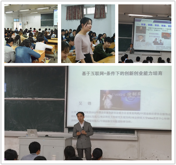 讲座中,吴锋围绕何为创新创业、为什么要进行创新创业、如何进行互联网+时代的创新创业以及成功创客的能力塑造这四个方面深入剖析在新时代背景下作为大学生应当如何夺得先机以及如何将自己培养成具有创意意识的人才。他例举了一些大学生创业的榜样和创业模式,激励同学们要培养创新能力,以创业的心态去就业,他勉励同学们不要羡慕别人的成功,自己要努力适应时代的变化。