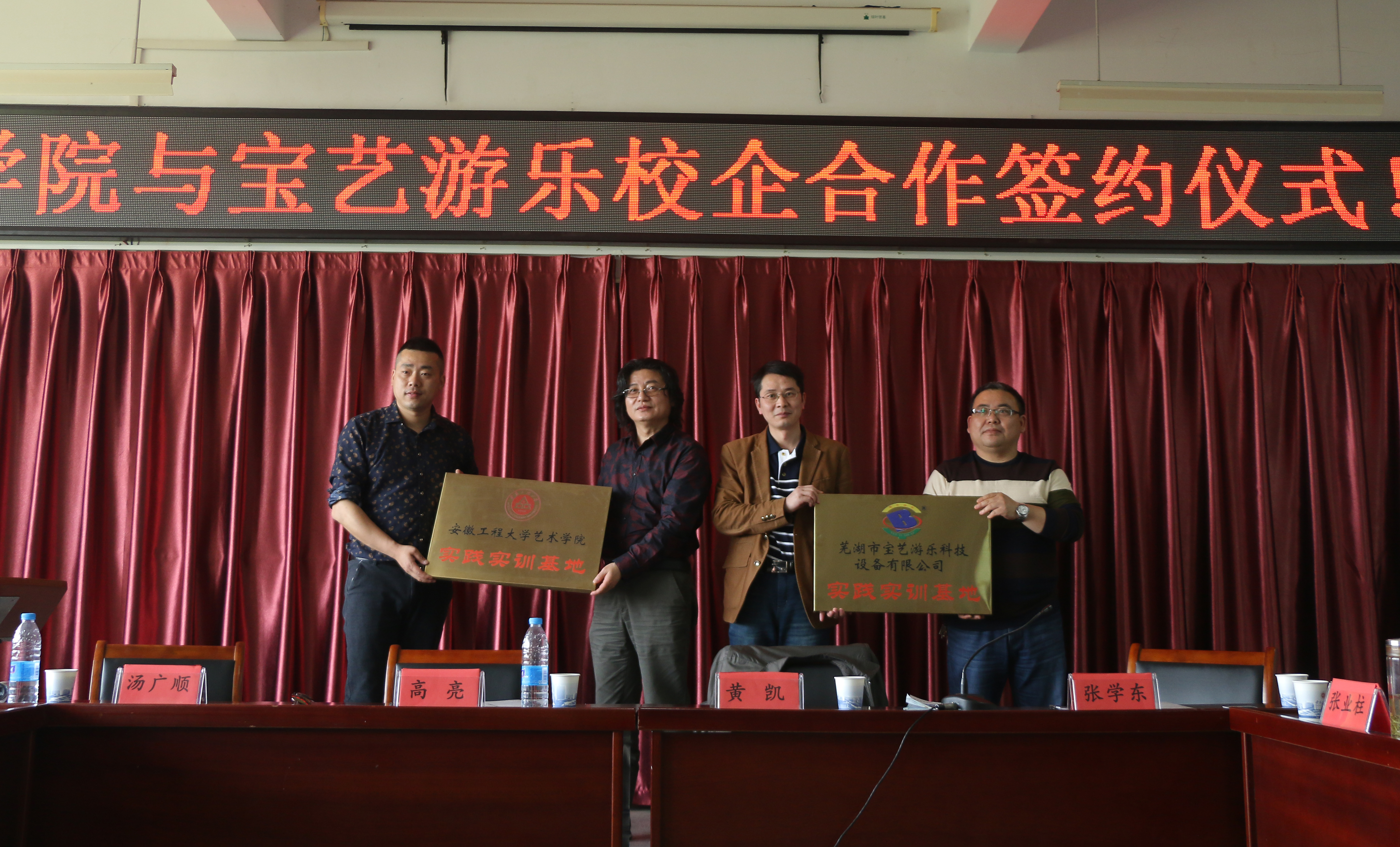 4月17日下午,艺术学院与芜湖市宝艺游乐科技设备有限公司的校企合作签约仪式成功举办。出席此次签约仪式的有艺术学院院长黄凯、副院长张学东,企业总经理高亮、汤广顺,艺术学院专业老师南海涛、张业柱及部分学生等。