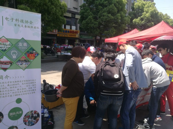 由于第一次在柏庄社区进行家电科普义务维修,社区居民并不了解,于是志愿者们主动向周围的路人介绍志愿服务活动。随后,居民们陆续送来了家里有故障的电器,如充电器、电水壶、电风扇、电饭锅等。志愿者们分工明确,一部分负责维持秩序,并向居民普及宣传安全用电和家电正确使用维护的相关知识,另一部分则利用专业知识仔细检查、分析每件电器存在的问题,排除故障。