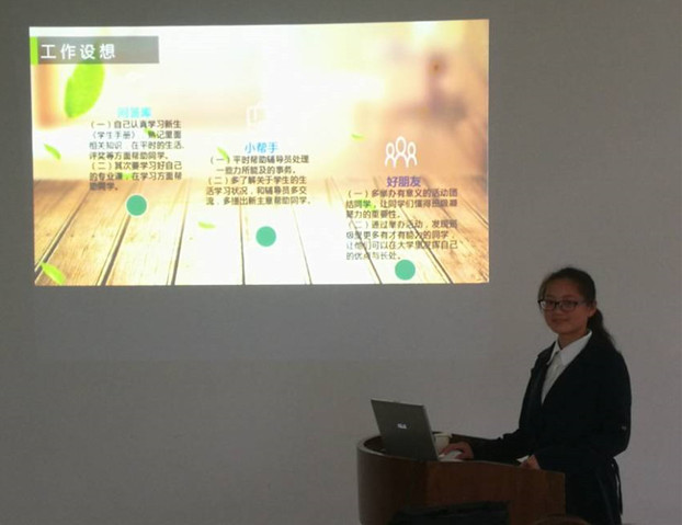 参加面试答辩的同学按抽签顺序依次上台,同学们结合PPT从自我介绍和工作设想两方面进行三分钟的风采展示。各位评委就“学长导员应具备什么素质”、“在军训场地遇到突发状况该怎样处理”,“学校关于学生管理的有关规定”等进行提问,有的评委还针对同学们展示的内容与其进行了细致深入的讨论。最后,学院专门召开辅导员会议,结合笔试与面试答辩成绩,讨论确定了六名同学为2017级新生班级学长导员。