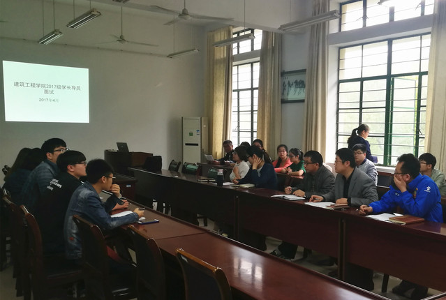 4月25日下午,建筑工程学院2017级新生班级学长导员竞聘面试答辩在学院会议室举行。学院党委副书记李烨、团委书记刘海涛、全体辅导员、2016级学长导员等担任评委。
