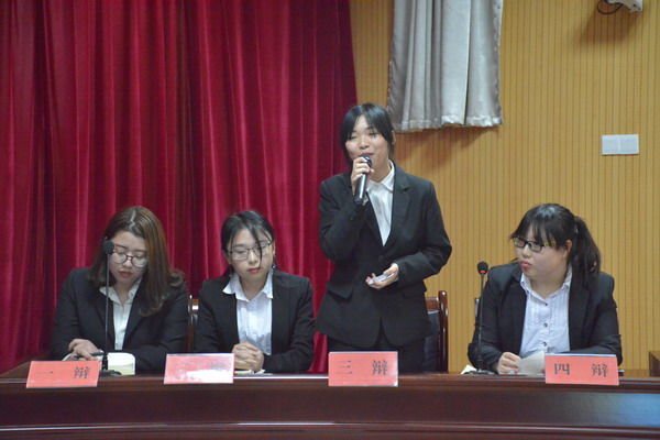 此次比赛分为六个环节。在立论陈词、驳辩和盘问环节,各参赛队根据抽签结果围绕“正方:夫妻财产应该共同制,反方:夫妻财产应该分别制”的话题展开激烈辩论。双方辩手对各自所持观点进行了具体陈词,辩手们引经据典,各抒己见,赢得了现场观众阵阵掌声,尤其是在“攻辩阶段”和“自由辩论”环节的精彩辩论赢得了全场的连声叫好与热烈掌声,将气氛一次次推向高潮。经过一番激烈的辩论后,最终八只代表队脱颖而出进入了决赛;姚舒阳等七位同学获得优秀辩手称号。