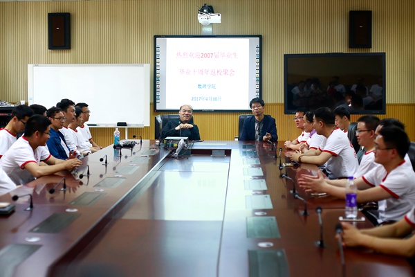 下午,校友们赠送数理学院“桃李满天下”的铁画,寄托着对母校的深情厚爱,并在学院门前合影留念。随后,在数理学院学术交流室召开了毕业10周年座谈会,学院院长费为银、党委副书记水心宝出席了会议。会议由费为银主持。
