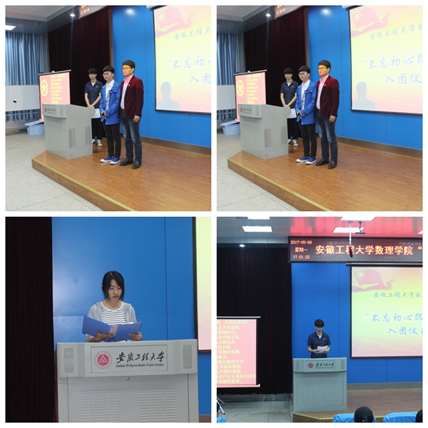 5月9日,数理学院在5教117举办主题为“火红的青春,庄严的承诺,不忘初心跟党走”新团员入团宣誓暨重温入团誓词活动。数理学院党委副书记水心宝,辅导员李悦、满志宏以及各班级团干及团员代表参加了活动。宣誓活动由优秀团员代表统计151班韩林主持。