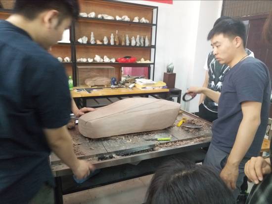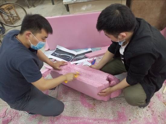 第一天,刘曙彦详细讲授了油泥模型制作流程等方面的知识。他强调油泥模型是汽车设计过程中必不可少的一个环节,是3D打印等技术无法替代的。油泥模型能够快速验证设计师的方案,帮助设计师推敲方案的细节,更加直观的用于方案的评审。在评审环节需要制作1:4等不同比例的模型,后期还需要制作1:1的油泥模型,再通过逆向进行A面制作,是一个非常专业的制作流程。设计师需要掌握油泥模型制作的流程和工艺,对设计师的造型落地有很大的帮助。之后,按照制作的流程,刘曙彦和夏亮指导四组学生开始制作油泥模型。当天晚上完成卡板的制作和模型内芯的制作,并指导卡板切割和内芯大小方面的注意点。