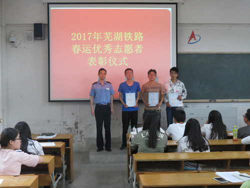 多年来,千余名大学生志愿者参与“暖途”志愿服务,直接或间接服务旅客人数达百余万人。吴志祥对志愿者提供的热心服务与辛苦工作表示感谢讲座结束后,吴志祥为李勇、邬兵、吴江江志愿者颁发了全国铁道团委评选的“优秀志愿者”荣誉称号,并授送锦旗。