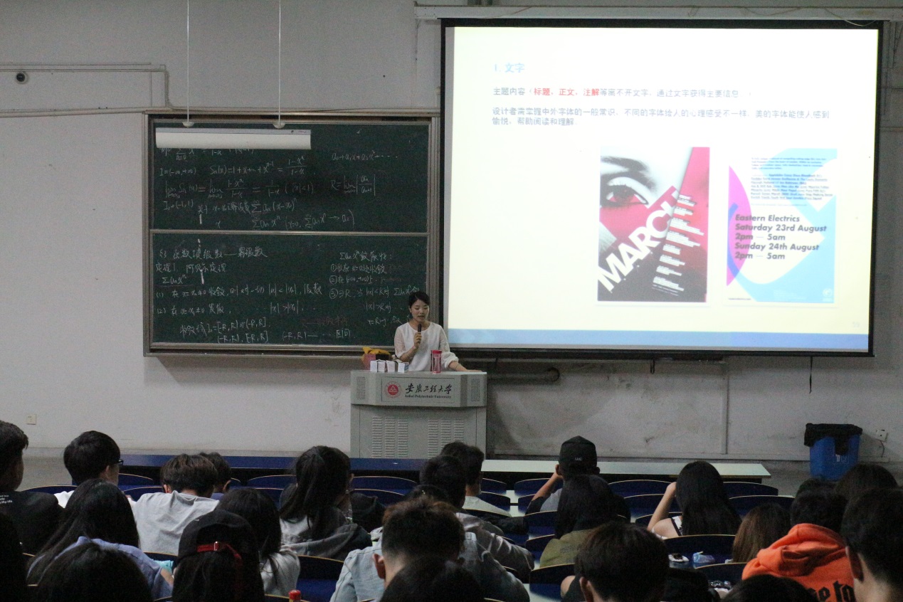 张翠开场就向同学们强调了平面设计在当今社会所涉范围之广及其可观的应用前景,同学们如果能在这一领域学有所成,将为追逐梦想,创造未来奠定坚实的基础。张翠具体分析了学院各个专业与平面设计的联系,让同学们深刻意识到平面设计的重要性。她一方面向同学们展示了平面设计的魅力,另一方面让同学们认识到有关平面设计学习的迫切性。接着,她给大家分享了一些字体、logo、海报、VI等多种平面设计的优秀案例。期间她向大家强调了平面设计中创意的重要性。她指出,只有兼具好的创意和过硬的专业本领,同学们才能想出好的方案,做出好的设计,在平面设计这一领域有所成就。最后,她给同学们展示了在平面设计领域有突出成就的几位大师的作品,既让同学们对目前的自己有一个更加准确的定位,又希望借此拓宽同学们的眼界,激励同学们努力学习,艰苦奋斗,在未来开拓一片属于自己天空。