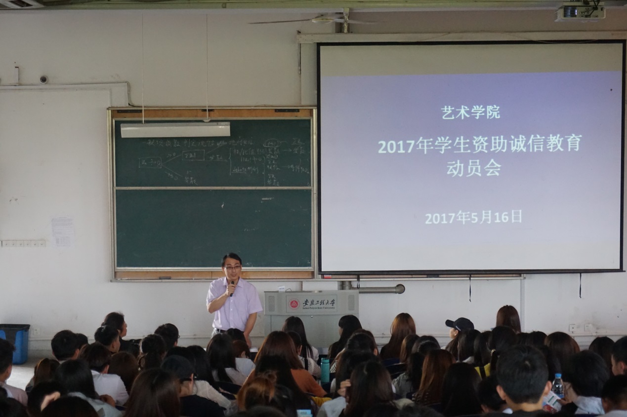 为了进一步增强大学生的诚信意识,提高大学生的综合素质,2017年5月16日,艺术学院在6教214教室召开2017年学生资助工作诚信教育动员会。院党委副书记孟向红,辅导员倪艳、张翠、滕敏出席了会议,会议由院团委书记迟传德主持。