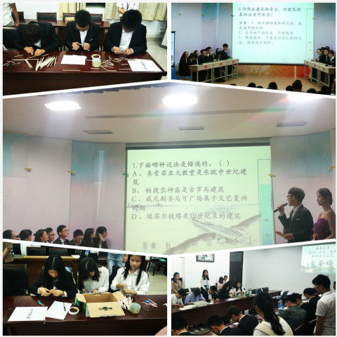 5月16日晚7时,由校团委举办、建筑工程学院承办的校第六届“建筑·文化·艺术”知识竞赛决赛在学术报告厅举行。比赛邀请建筑工程学院骨干教师周华聪、付晓惠、曹兵、舒明洋等担任评委。建筑工程院党委副书记李烨、团委书记刘海涛、辅导员、各学院学生会主席等到场观看比赛。