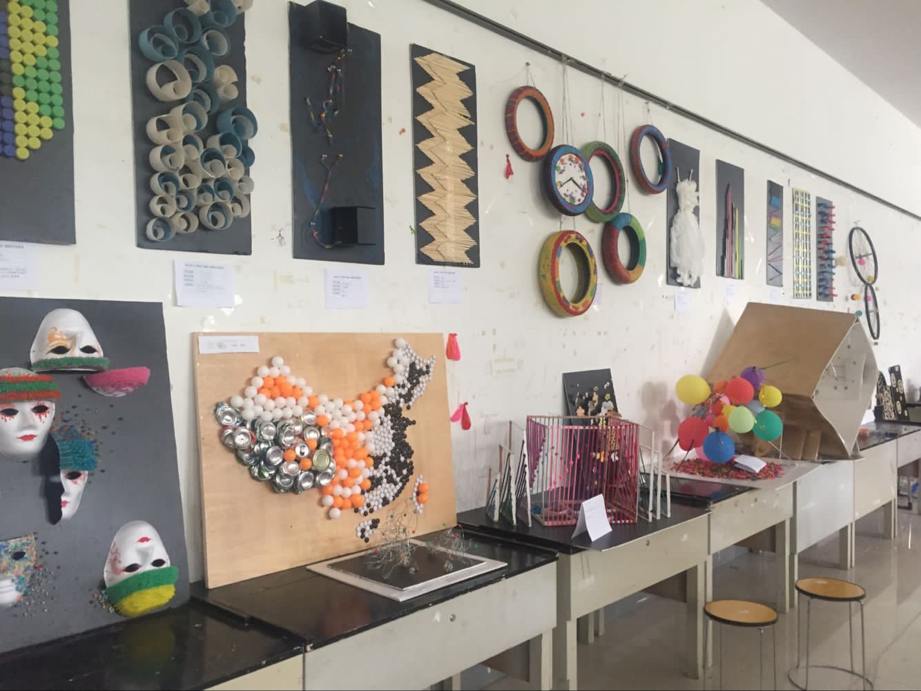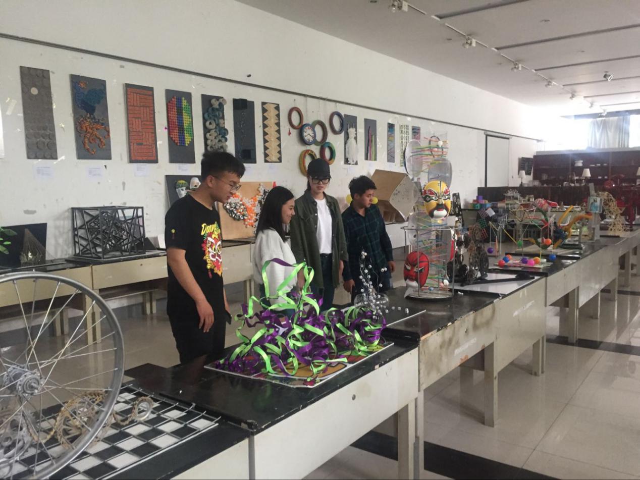 在各位老师的指导下,同学们从我们的生活中,从自己的身边寻找构成材料。再通过老师的指引,自己的精心制作,展现其艺术性。展览中既有刚硬豪放的,也有精美别致的。其貌不扬的材质在同学们的手中变化、排列,赋予其特殊内涵,展示其“美”的形态。同时广大同学也在摸索设计的灵感,为之后的设计打下坚实的基础,以便做出更富有深意的设计。