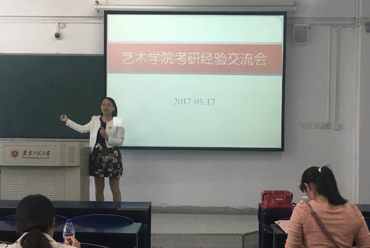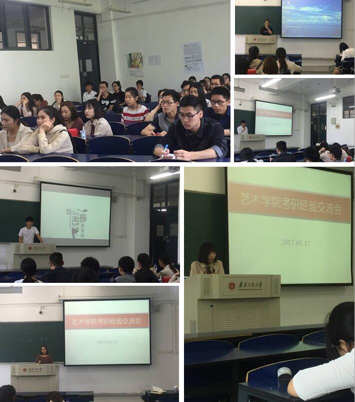 5月17日下午,为激励14级考研的同学们,艺术学院在6教105教室举办了一次考研交流会。本次交流会邀请了考上合肥工业大学研究生的吴安国同学、考上华东理工大学研究生的蒋涛同学、考上南京师范大学研究生的任娟娟等同学。参加这次交流会的同学主要有艺术学院2014级各专业励志考研的同学们。辅导员倪艳老师、滕敏出席此次活动,会议由倪艳主持。