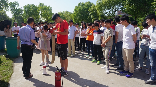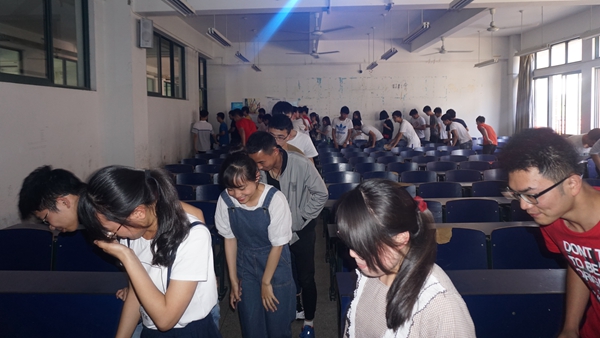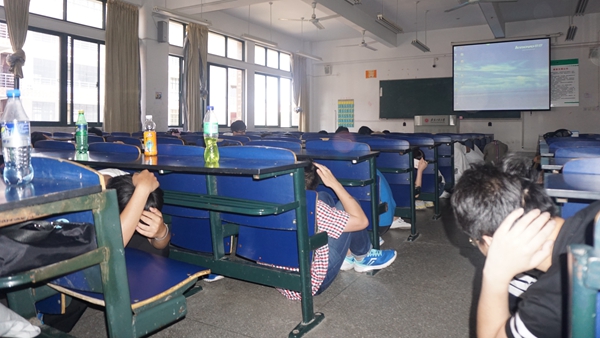 演练之前,学院通过微信公众号宣传防震减灾相关知识,各班级进行相关知识的宣传。参加现场演练的全体人员还在苑雨露老师的带领下观看了防灾减灾应急疏散的视频,学习了在灾难出现时快速疏散的动作要领,以及如何有效地展开自救等知识。实际演练时,工作人员在演练楼层及疏散通道设置禁区,防止非参演人员进入演练区域。3点10分,一声哨响,参演人员迅速做出反应,一手抱头,一手扶住桌腿蹲在桌下。哨鸣30秒后,参演人员迅速从教室中间一分为二,同时迅速从前后两个门有序离开。为了模拟火灾演练的真实效果,工作人员特地在楼梯道口施放了烟雾弹,要求参演人员在视线被挡、呼吸受阻的情况下,能镇定迅速地撤离危险地带。参演人员在规定时间内到达指定避灾地点后,立即集合并清点报告人数。李岗点评了本次演练,指出参演人员在逃生中出现的问题并加以指导还向参演人员详细地讲解了如何使用消防栓和灭火器,鼓励他们在关键时刻应该大胆使用。