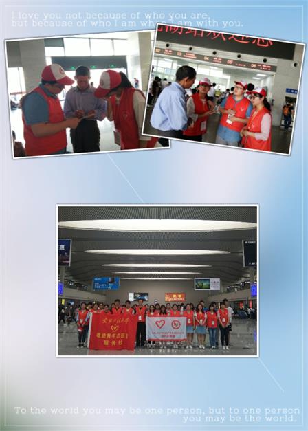 5月21日,人文学院第三期“青马工程”大学生骨干培训班为了增强学员服务社会的意识,加强大学生骨干的社会实践教育,大家走进老年公寓、万达广场和火车站开展了一系列社会志愿服务活动。