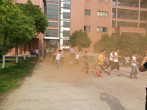 下午16:00,安全疏导员按要求到达指定地点后,辅导员苏醒老师带领参加演练学生学习了防震知识,熟悉了应急避险的正确方法。随后在苏醒的指挥下,模拟地震的急促刺耳的报警声突然响起,参演的同学们立即在教室进入震时紧急避险状态,学生立即用单手或书包等保护好头部,迅速躲在课桌下或内墙角进行应急避震,2分钟避险后,参加演练学生在安全疏导员的指挥下,快速、有序地按预定的疏散路线撤离到指定地点。演练用时五分钟,参加疏散演练师生共计160余名,演练全过程安全、有序、高效,达到了预定效果。随后,校保卫处工作人员现场为大家讲解了防震减灾及消防安全常识、消防器械的使用方法和注意事项。演练结束后,郭全根作了总结讲话,对同学们准确掌握逃生办法、路线、安全集结等表示肯定,同时就当前防溺水安全、消防安全、道路交通安全、饮食卫生安全等作了强调,希望大家通过演练活动增强防震减灾意识,提高应急反应和自救互救能力。