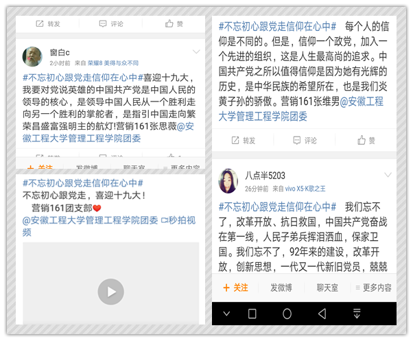 各团支部通过微信、微博和qq群等方式积极参与,发起“不忘初心跟党走信仰在心中:我想对党说”、“不忘初心跟党走:信仰在心中”、“喜迎十九大,我要……”多种话题内容。活动开始后学院团委对各团支部开展情况进行了初步评比,选拔出物流161、营销152、人力142等十个团支部进入决赛。决赛阶段各团支部以“不忘初心跟党走”为主题拍摄短视频,表明紧密团结在以习近平同志为核心的党中央周围的坚定决心和迎接十九大胜利召开的喜悦心情。同时通过发布微博话题“#不忘初心跟党走#”让同学们通过网络的方式充分参与,调动了广大同学的积极性,表达了内心对党的忠诚与信仰。决赛结束后,学院团委对本次主题团日活动进行了评比,最终物流161、营销161团支部获得一等奖,工商162团支部获得优秀组织奖。
