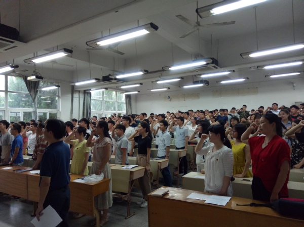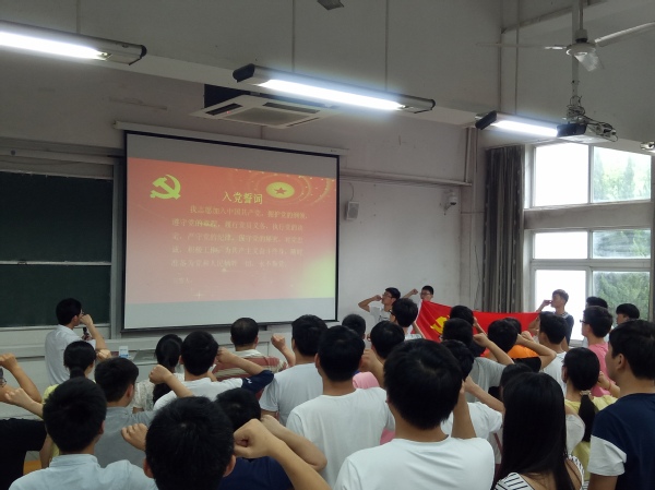 会上,杨会成带领全体学生党员进行新党员入党宣誓暨老党员重温入党誓词仪式。面对鲜红的党旗,大家高举右手,发出铮铮誓言。随后,杨会成和郭全根为新发展入党的学生党员代表佩戴党员徽章。杨会成指出,通过新党员入党宣誓暨老党员重温入党誓词活动,激励新老党员严格要求自己,牢记入党誓词,不忘初心,以党章规范自己的言行,在今后的学习工作中,一定要向优秀党员学习,学习他们勇于奉献和担当的精神。同时,要通过“两学一做”学习教育,不断提高自身思想觉悟,并以优秀党员为标尺,积极主动在“做”上下功夫,努力践行党的宗旨。