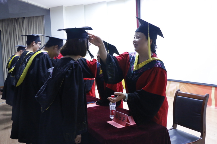 随后,在喜庆欢快的音乐声中,主席台就座的领导、老师逐一为获得学位的同学扶正流苏,一个轻轻的握手、一声仔细的叮咛,充分表达了学校和老师们对毕业生们学业有成的肯定与衷心的祝福。