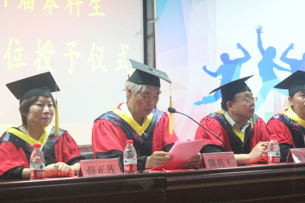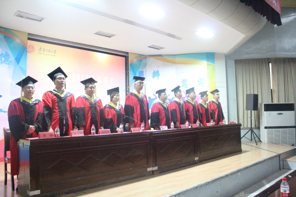 校党委书记陈其工、生化学院党委书记陶玉贵、副院长薛正莲、副书记王辉、系部主任和全体辅导员以及2017届毕业生参加了毕业典礼。典礼由王辉主持。典礼在全体奏唱庄严的国歌中拉开序幕,薛正莲宣读了2017届毕业生毕业的决定,宣告 695 名同学正式毕业。陶玉贵宣读了康潘星等21 人安徽省品学兼优毕业生的名单和叶女英等19 名校优秀毕业生名单,优秀毕业生代表上台接受表彰。随后主席台领导为毕业生代表颁发了毕业证书,为获得学士学位的毕业生扶正流苏。