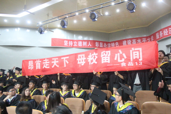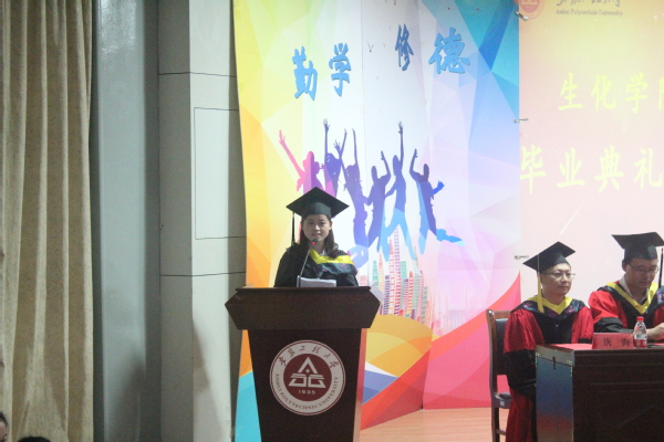 毕业生代表环工132的金慧发言时称,大学四年是她成长最快的四年,她学会了独立,学会了与人沟通,学会了自主学习和自律。当离别时,最不舍的是师生情谊和同窗好友,她感谢敬爱的老师,感谢他们课堂上的循循善诱和课堂下的谆谆教诲。她不舍同窗,她说,“我们共同谱写了一段纯真的青春记忆,我们友谊的小船将永远不翻!”