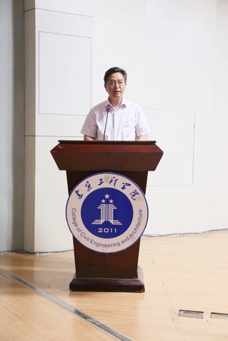 郭兴众在典礼上发表了热情洋溢的致辞。他首先向圆满完成学业的毕业生表示最真诚、最热烈的祝贺,对辛勤工作、无私奉献的老师们致以最诚挚的敬意。他饱含深情地说,四年里,你们耕耘理想、追求真理、刻苦学习、勤于实践,收获了扎实的专业知识、创新的建筑理念、辩证理性的思维习惯。四年里,你们在学习科研、志愿服务、义务支教、对外交流,以及各类竞赛活动中为学校、学院争得了众多荣誉。建工学子的拼搏精神,已成为一道亮丽的风景线定格在校园。在建筑工程学院这个年轻而充满活力的大家庭中,既有“土”的踏实和厚重,也有“木”的挺拔与秀丽,既有“水”的活力与灵动,又有“管理”的睿智与创新。在学院党政领导下,不仅党政工作有创新、“七彩团建”有特色,学科、师资、教学、科研更是取得了显著的成绩。