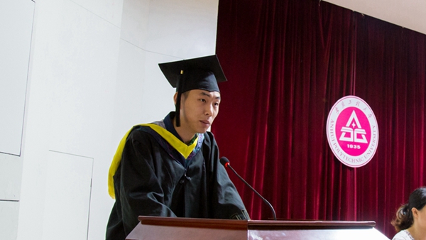 毕业生代表武乾坤代表全体毕业生向学校、老师、父母表达了衷心的感谢。他讲述了这四年中他所有宝贵的经历和体会,同时表达了对母校、老师和同学的不舍和留恋。他表示以后无论何时何地,都会心系母校,尽最大能力为我校争光。