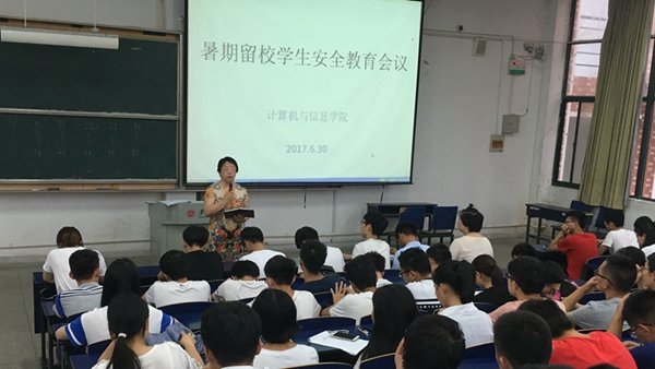 留校学生安全教育会上,葛伟阳宣读了《计算机与信息学院暑假留校学生管理办法》,明确了相关要求和注意事项。章靖平介绍了假期学校的管理和服务情况,强调了每日汇报的重要性,要求每位学生遵守纪律和学校有关规定,注意安全,加强自我管理,希望同学们过一个安全、有意义的假期。会议最后,各年级辅导员分别召开年级会,确定各专业假期安全负责人,并将留校注意事项具体到细节。