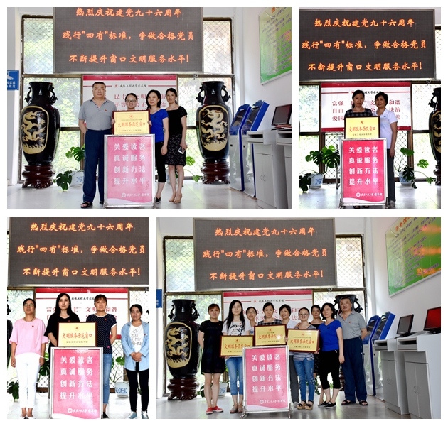 为树立“两学一做”学习教育中的先进典型,彰显立足本职岗位践行“四有”标准,争做合格党员的实效,在全馆员工中树立学习的榜样和目标,激励全馆职工努力践行“读者第一,服务至上”的办馆宗旨和“关爱读者、真诚服务、创新方法、提升水平”的工作理念,在建党96周年来临之际,图书馆对上述3个窗口进行了挂牌表彰,并给予了适当的物质奖励。