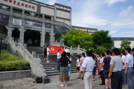 仪式结束,全体党员进馆参观。陈列馆庄严宏伟,展示了新四军从1937年组建到1947年撤销番号的10年波澜壮阔的征程。展览内容系统完整、形式多样,全方位、多角度地反映了新四军的历史。一幅幅珍贵的历史照片将党员们带回了硝烟弥漫的战争岁月,历史以不可辩驳的事实再次证明,中国共产党和包括新四军在内的党领导下的人民军队是抗日战争的中流砥柱。