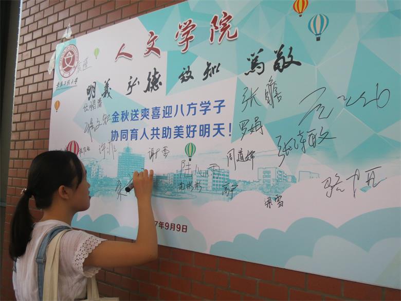 炎炎烈日,难敌新生求学渴望;默默奉献,方显学院真心实意。对于每位大学新生来说,开学报到是人生最美好的一个片段。为了给大学新生留下一段珍贵的记忆,人文学院为大学新生举办了创意签名活动。