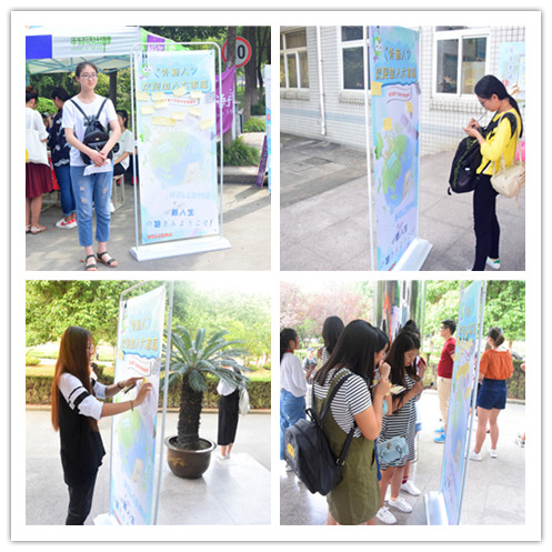 萌新们拿着便利贴,将自己对大学新生活的所感所想先记录下来,贴在“外新人”上,亦如给这烂漫的金色季节,添上属于她们自己的颜色!