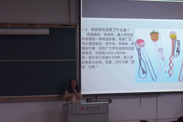 朱文明老师从学生寝室用电、防火着手,强调在寝室内不允许私拉乱接电线、违规使用大功率电器和使用蜡烛、酒精炉等易燃易爆物品,养成人走关电的良好的用电习惯。以芜湖市和周边发生的溺水意外事件为例,提醒同学们不私自到江、河、湖泊游泳。