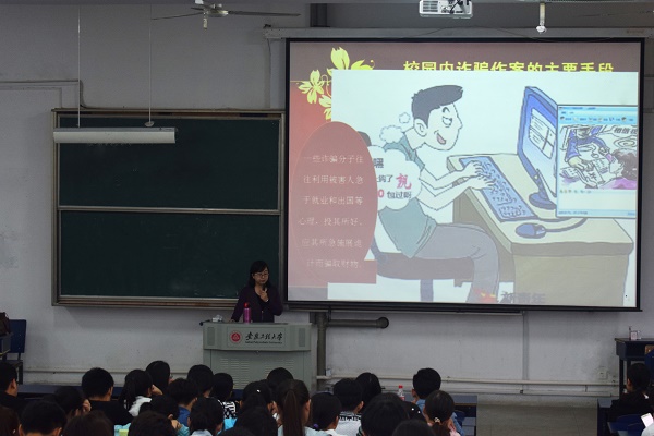 盛洁老师介绍了校园内外常见的诈骗种类、作案方式,以案例的形式让同学们识别诈骗者的真实面目,在平时的生活中谨慎交友、和父母保持联系、提高处理问题能力。