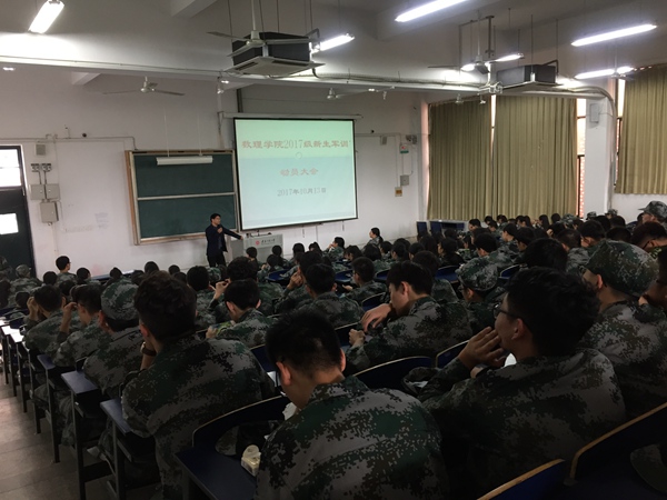金秋十月,丹桂飘香。为迎接党的十九大胜利召开,引导2017级新生学子以良好的精神状态投入新学期的军训,10月13日下午,数理学院2017级新生军训动员会于6教214教室顺利召开。数理学院党委副书记水心宝,大一辅导员蒋书云,以及全体大一全体新生参加了动员会。会议由蒋书云主持。