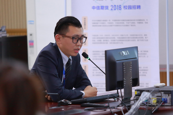 蒋宇轩结合当前激烈的就业形势,围绕金融期货的就业前景、中信期货企业介绍与人力资源政策,以及中信期货上海分公司芜湖营业部2018年的招聘计划等向大家做了详细的介绍。他认为,随着我国“一带一路”倡议的深入推进,我国实体经济的发展必将要求更多金融机构积极拓展金融合作空间,吸纳更多、更优质的金融人才,这既为同学们的就业提供了难得的历史性机遇,也带来了巨大的挑战。他希望大家结合自身实际,积极转变就业观念,夯实专业素养,提升就业综合能力与素养,勇于投身于这一历史洪流之中。