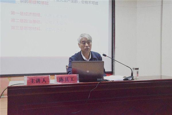 陈其工分别从《共产党宣言》及其当代价值、中国特色社会主义与“四个自信”、青年的时代责任与历史使命等三个方面,结合习近平总书记在党的第十九次全国代表大会开幕式上所作的报告,旁征博引,谈古论今,娓娓道来,深刻阐述了马列主义的理论精髓和中国特色社会主义的时代特征。他指出,要坚定共产主义理想信念,必须要用心研读马列主义经典原著,了解掌握欧洲工业革命以来世界工人运动的历史脉络及其经济社会根源,深刻认识近代以来中华民族救亡图存直至新民主主义革命、社会主义革命和建设的整个历史进程。他深入浅出地为大家解读了《共产党宣言》诞生的背景、前提和基础,《宣言》的文本结构、主要内容与当代思考,社会主义实践的巨大挫折与光明前景,马克思主义中国化的两次飞跃和最新成果——习近平新时代中国特色社会主义思想,指出自信来源于伟大的实践、来源于人民的选择、来源于对于真理的掌握,坚定“四个自信”就是坚定对中国特色社会主义的自信。最后,他勉励广大同学,要树立无愧于伟大时代的远大理想,担当起无愧于伟大时代的历史使命,脚踏实地,为实现中国梦不懈奋斗。