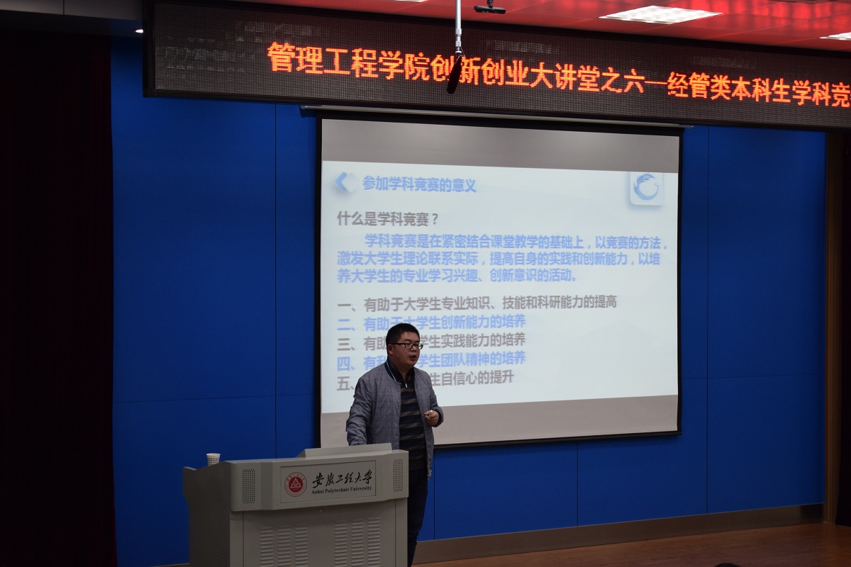 为加深大学生对学科竞赛的了解,鼓励大学生积极参加学科竞赛,帮助更多的大学生在学科竞赛中取得好成绩,10月24日晚7点,管理工程学院创新创业大讲堂邀请学院2006级校友邹辉老师,在5教117录播室以“经管类本科生学科竞赛经验分享”为主题开展第六期创新创业讲座。学院党委副书记程繁、团委书记朱文明、辅导员张孝琪以及大二年级各专业学生代表聆听了讲座。