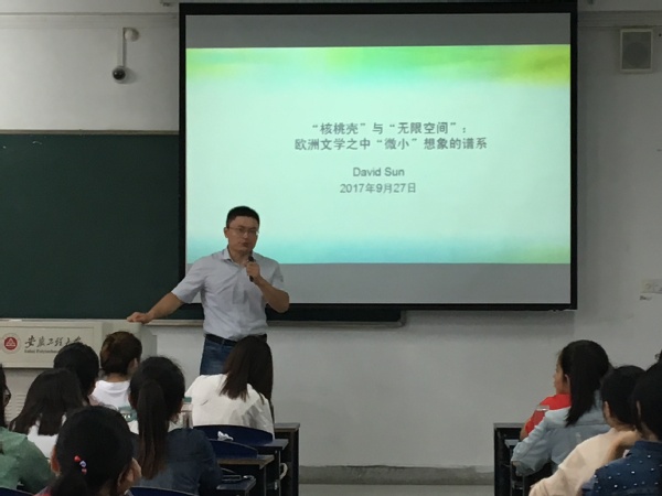 中国人民解放军陆军工程大学博士孙红卫为学生作了题为《“核桃壳”与“无限空间”:欧洲文学之中“微小”想象的谱系》的讲座。从大学生熟知的原子理论和中国古代文学名篇《核舟记》入手,引出西方文学中也有诸多关于核桃壳的意象与指涉,指出欧洲文学自古至今都有青睐“小”、表现“小”和“以小见大”的文学意图,分别以罗伯特·瓦尔泽、米兰·昆德拉、乔伊斯、贝克特等作家的作品为例,论述欧洲文学中“微小”想象的谱系,集中体现了在现代、后现代主义时期人在荒诞世界中的“渺小”与生活的“虚无”。