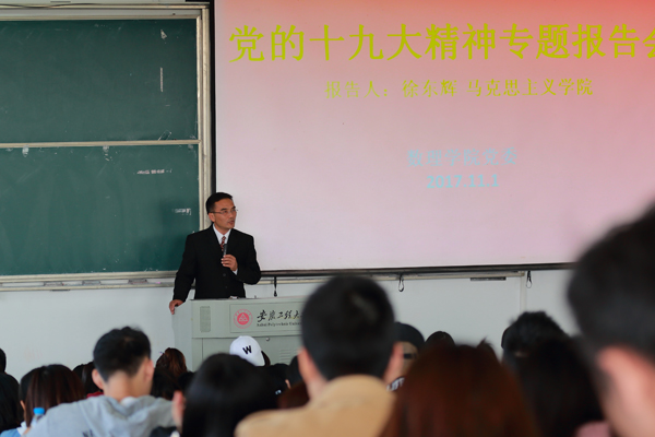 11月1日下午,马克思主义学院徐东辉老师应邀在5教217教室为数理学院师生作了学习贯彻党的“十九大”精神专题报告会。数理学院党政领导,全体师生党员、全体教师以及第22期入党积极分子培训班全体学员聆听了报告。报告会由数理学院党委书记周毅仁主持。