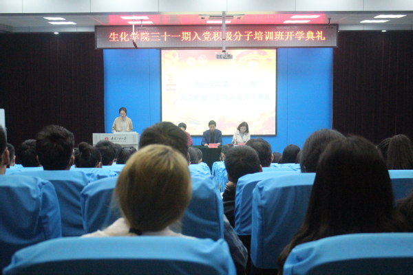 11月3日下午5点,生化学院在5教117举行第三十一期入党积极分子培训班开学典礼。典礼由本期党校班主任章文宜老师主持,共113名入党积极分子参加。生化学院党委副书记王辉、团委书记胡云和部分学生党支部书记出席典礼。