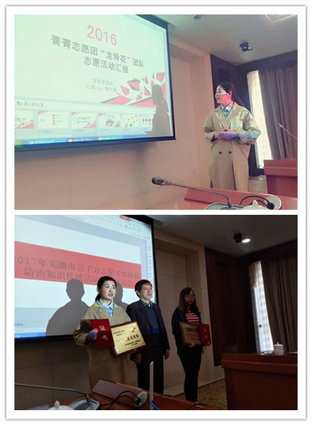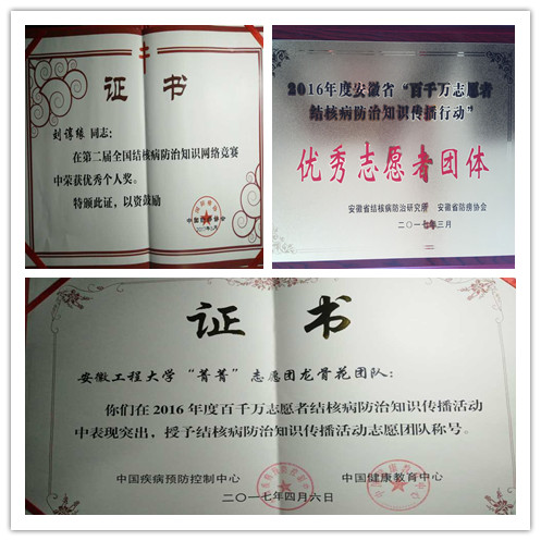 会上表彰了2016年度“百千万志愿者结核病防治知识传播行动”中取得突出成绩的优秀志愿者团体、个人以及在第二届全国结核病防治知识网络竞赛中获得省级优秀团体、个人。我校外国语学院刘谆缘获得第二届全国结核病防治知识网络竞赛优秀个人奖,我校菁菁”大学生志愿服务团龙骨花团队荣获“百千万志愿者结核病防治知识传播行动”国家级和省级优秀志愿者团体称号,这也是该团队连续第三次获得省级荣誉。