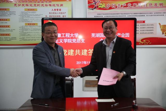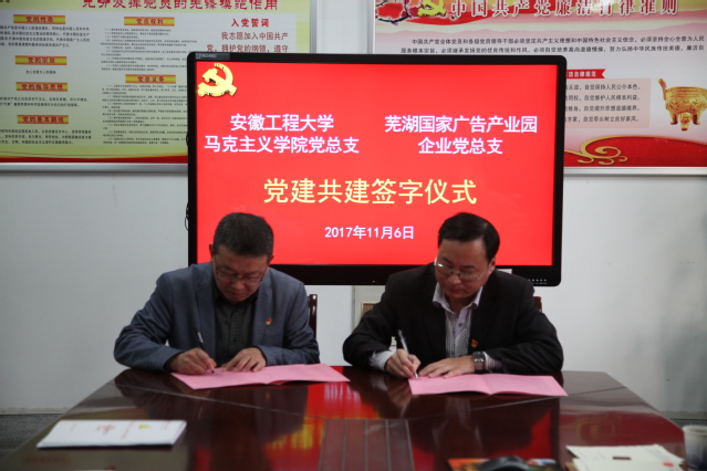 马克思主义学院党总支与芜湖国家广告产业园企业党总支开展的党建工作结对共建活动,以中国特色社会主义理论体系为指导,坚持“围绕中心、服务大局、统筹兼顾、整体推进”的原则,按照“资源共享、优势互补、共建共驻、共同发展”的思路,双方将通过理论学习互帮、党员干部互动、组织建设互促、党建载体互用、结对帮扶互助等多种途径,充分发挥各自资源优势和业务专长,落实基层党组织标准化建设关于开展党建“共建共驻”活动要求,共同促进党组织全面建设和党员素质的提高,确保“两学一做”学习教育常态化落到实处,形成党建工作相互借鉴、相互提高、共建共赢的良好格局。