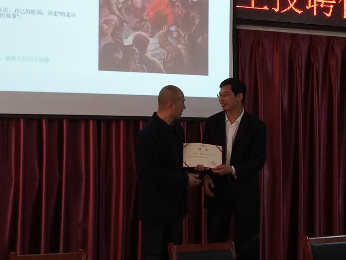 马精虎是中国著名青年油画家,他的到来,受到广大师生热烈欢迎。刘金斌首先致欢迎辞,承杰介绍了马精虎基本情况。介绍完毕后,刘金斌向马精虎颁发了聘书。