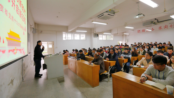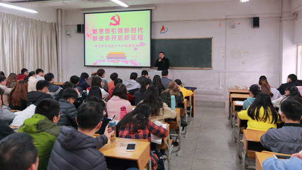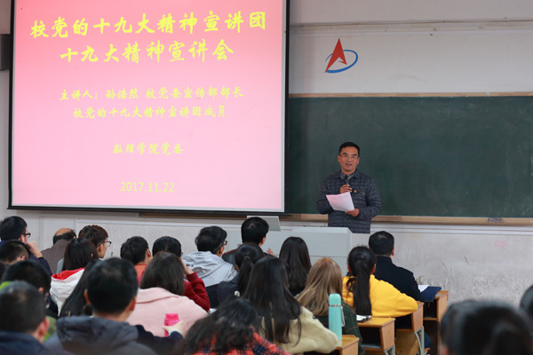 会上,孙浩然说,党的十九大胜利闭幕后,学校党委高度重视,迅速成立了校党的十九大精神宣讲团,加强党的十九大精神的学习宣传贯彻。他指出,党的十九大精神内容博大精深,立意高远,务必要掌握科学的学习方法,精专细研,融会贯通,在“学懂”、“弄通”、“做实”上下功夫,要把学习宣传贯彻党的十九大精神作为当前和今后一个时期最大的政治任务。他紧紧围绕党的十九大会议的主题、主要成果,习近平新时代中国特色社会主义思想的重要意义、历史贡献、丰富内涵、实践要求,过去五年的历史性成就与变革,中国特色社会主义进入新时代的基本依据、丰富内涵、重大意义、新的部署,以及新时代党的建设总体要求等内容,带领大家对党的十九大报告的具体内容进行了详细的学习和解读。最后,他对近年来数理学院所做的工作给予肯定,他希望数理学院全体师生深入学习党的十九大精神,用习近平新时代中国特色社会主义思想武装头脑,牢记教书育人使命,坚持立德树人根本任务,为把学校建设成“国内知名、省内一流的地方特色高水平大学”作出新的更大贡献。他希望青年学子要志存高远,脚踏实地,勇于担当时代赋予的历史使命,在实现中华民族民族伟大复兴的中国梦的实践中实现自我的人生价值。