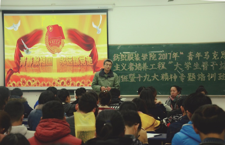 为深入学习贯彻落实十九大精神,带动全院团员青年用习近平新时代中国特色社会主义思想武装头脑,11月29日下午,纺织服装学院“青年马克思主义者培养工程”大学生骨干培训班暨十九大精神专题培训班在D座413开班。86名学员由各班级团支部书记、班长以及学生会主要学生干部组成。院党委书记纪天新、院团委书记李校林、辅导员陈倩、童朝梅参加了开班仪式。